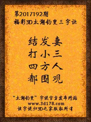 福彩第2017192期3d太湖字谜:结发妻,打小三,四方人,都围观