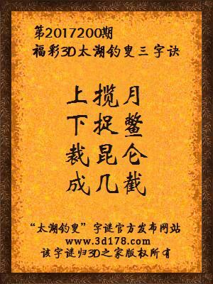 今日3d太湖字谜总汇,3d之家为您详细解答2017200期3d太湖字谜,并汇总多位专家精解太湖字谜供参考。