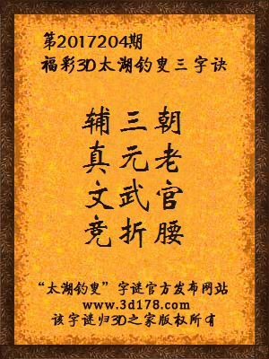 福彩第2017204期3d太湖字谜:辅三朝,真元老,文武官,竞折腰