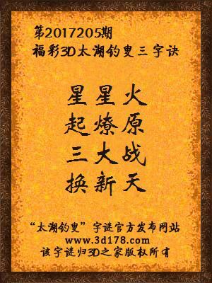 福彩第2017205期3d太湖字谜:星星火,起燎原,三大战,换新天