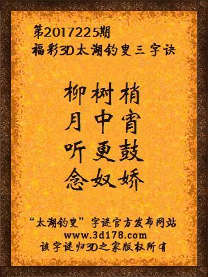 福彩第2017225期3d太湖字谜:柳树梢,月中宵,听更鼓,念奴娇