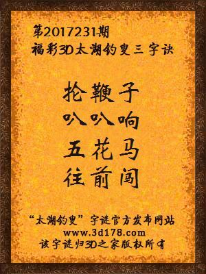 福彩第2017231期3d太湖字谜:抡鞭子,叭叭响,五花马,往前闯