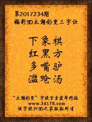 福彩第2017234期3d太湖字谜:下象棋,红黑方,多嘴驴,滥呛汤