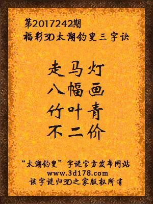 福彩第2017242期3d太湖字谜:走马灯,八幅画,竹叶青,不二价