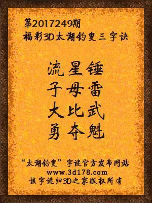 福彩第2017249期3d太湖字谜:流星锤,子母雷,大比武,勇夺魁