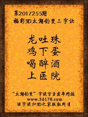 福彩第2017255期3d太湖字谜:龙吐珠,鸡下蛋,喝醉酒,上医院