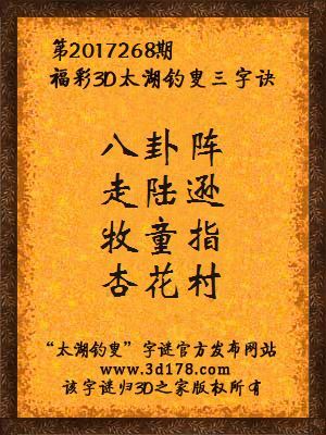 福彩第2017268期3d太湖字谜:八卦阵,走陆逊,牧童指,杏花村