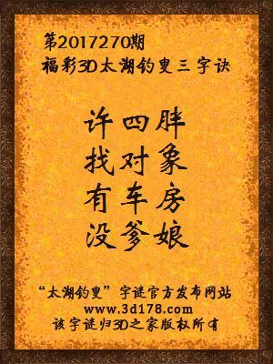 福彩第2017270期3d太湖字谜:许四胖,找对象,有车房,没爹娘