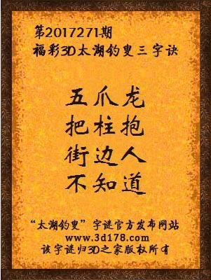 福彩第2017271期3d太湖字谜:五爪龙,把柱抱,街边人,不知道