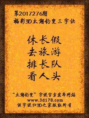 福彩第2017276期3d太湖字谜:休长假,去旅游,排长队,看人头