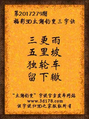 福彩第2017279期3d太湖字谜:三更雨,五里坡,独轮车,留下辙