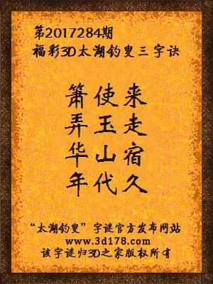 福彩第2017284期3d太湖字谜:箫使来,弄玉走,华山宿,年代久