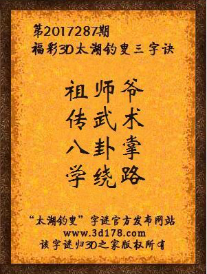 福彩第2017287期3d太湖字谜:祖师爷,传武术,八卦掌,学绕路