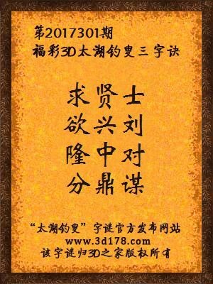 福彩第2017301期3d太湖字谜:求贤士,欲兴刘,隆中对,分鼎谋
