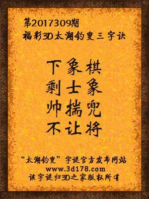 福彩第2017309期3d太湖字谜:下象棋,剩士象,帅揣兜,不让将