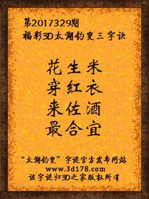 福彩第2017329期3d太湖字谜:花生米,穿红衣,来佐酒,最合宜