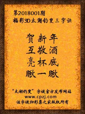 下面开始解3d第2018001期太湖字谜:贺新年,互敬酒,亮杯底,瞅一瞅