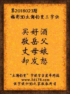 下面开始解3d第2018023期太湖字谜:买好酒,敬岳父,丈母娘,却发怒