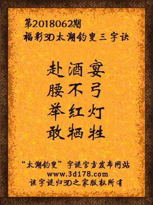 福彩第2018062期3d太湖字谜:赴酒宴,腰不弓,举红灯,敢牺牲