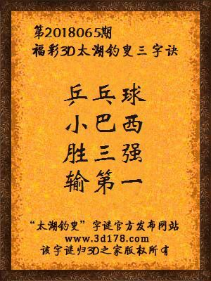 福彩第2018065期3d太湖字谜:乒乓球,小巴西,胜三强,输第一