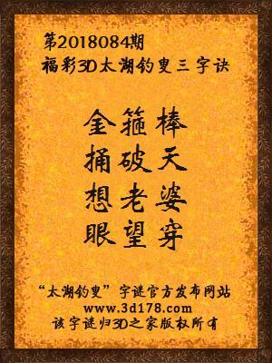 福彩第2018084期3d太湖字谜:金箍棒,捅破天,想老婆,眼望穿