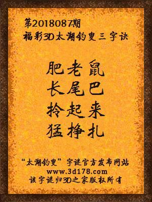 福彩第2018087期3d太湖字谜:肥老鼠,长尾巴,拎起来,猛挣扎