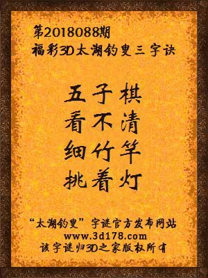 福彩第2018088期3d太湖字谜:五子棋,看不清,细竹竿,挑着灯