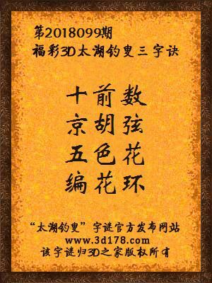 福彩第2018099期3d太湖字谜:十前数,京胡弦,五色花,编花环