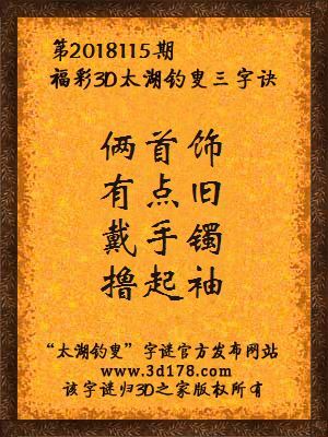 福彩第2018115期3d太湖字谜:俩首饰,有点旧,戴手镯,撸起袖