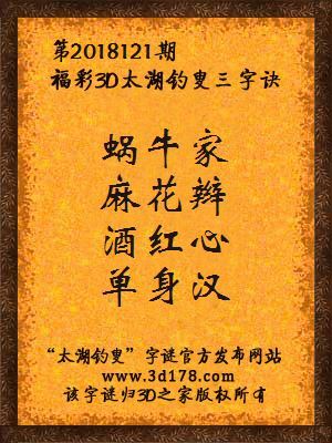 福彩第2018121期3d太湖字谜:蜗牛家,麻花辫,酒红心,单身汉