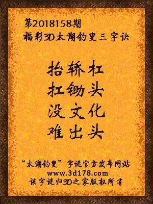 福彩第2018158期3d太湖字谜:抬轿杠,扛锄头,没文化,难出头