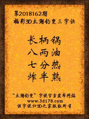 福彩第2018162期3d太湖字谜:长柄锅,八两油,七分热,炸半熟