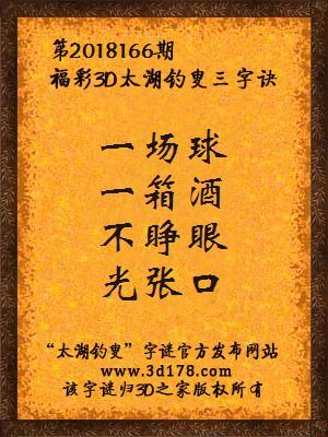 今日3d太湖字谜总汇,3d之家为您详细解答2018166期3d太湖字谜,并汇总多位专家精解太湖字谜供参考。