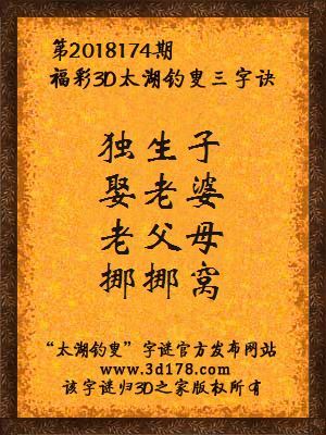 福彩第2018174期3d太湖字谜:独生子,娶老婆,老父母,挪挪窝