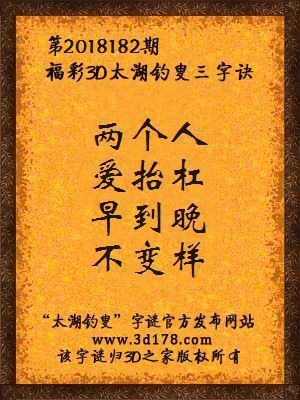 福彩第2018182期3d太湖字谜:两个人,爱抬杠,早到晚,不变样