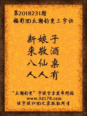 福彩第2018231期3d太湖字谜:新娘子,来敬酒,八仙桌,人人有