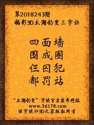福彩第2018243期3d太湖字谜:四面墙,围成圈,仨囚犯,都罚站
