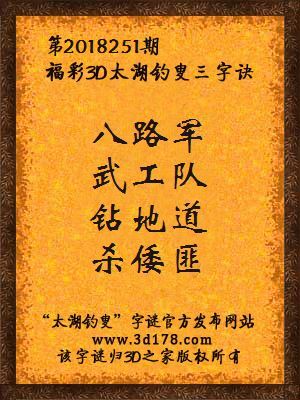 福彩第2018251期3d太湖字谜:八路军,武工队,钻地道,杀倭匪