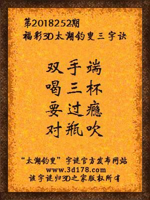 福彩第2018252期3d太湖字谜:双手端,喝三杯,要过瘾,对瓶吹