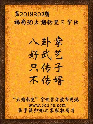 福彩第2018302期3d太湖字谜:八卦掌,好武艺,只传子,不传婿