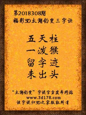 福彩第2018308期3d太湖字谜:五天柱,一泼猴,留字迹,未出头