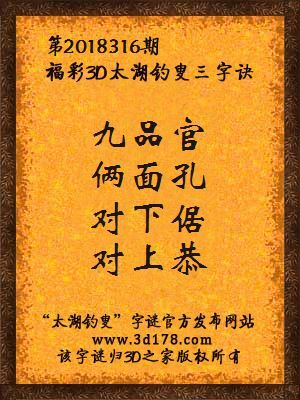 福彩第2018316期3d太湖字谜:九品官,俩面孔,对下倨,对上恭