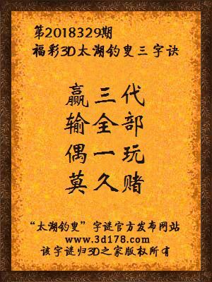 福彩第2018329期3d太湖字谜:赢三代,输全部,偶一玩,莫久赌