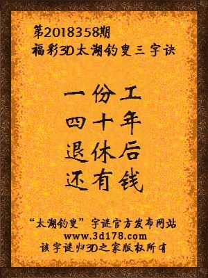 福彩第2018358期3d太湖字谜:一份工,四十年,退休后,还有钱