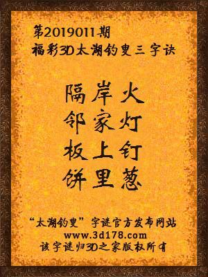 福彩第2019011期3d太湖字谜:隔岸火,邻家灯,板上钉,饼里葱